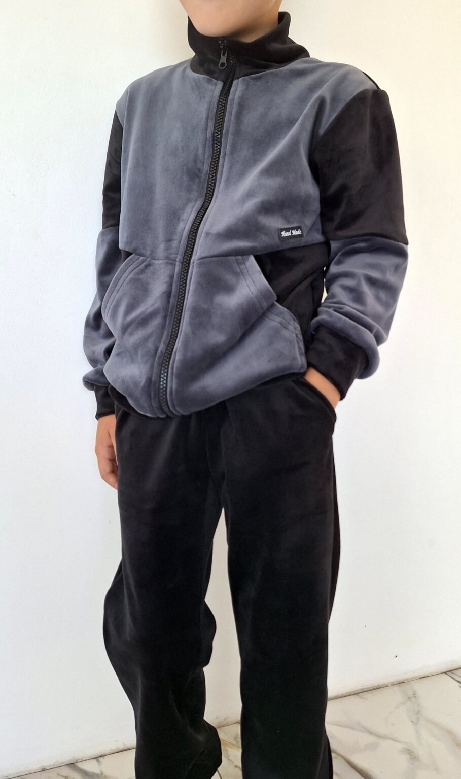 Kostiumėlis berniukui iš soft veliūro dviejų spalvų su užtrauktuku